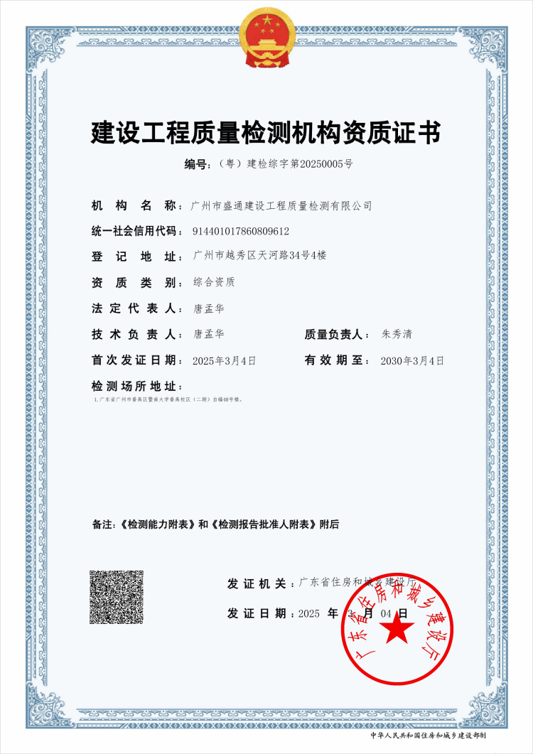 經(jīng)廣東省住房和城鄉(xiāng)建設廳審查認證,盛通檢測成功取得建設工程質量檢測機構資質(綜合檢測資質,編號:(粵)建檢綜字第20250005號),成為全省首批獲得建設工程質量檢測綜合資質的檢測機構之一。